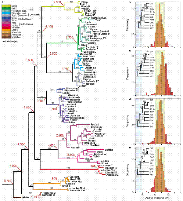 - Die Abspaltung des Hethitischen wäre etwa 6.800 v. Chr. und die des Tocharischen etwa 5.300 v. Chr. erfolgt.