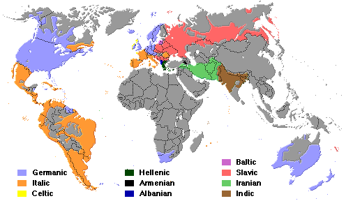 Das Ausbreitungsgebiet des Indoeuropäischen erstreckt sich über ganz Europa und das südliche Asien bis nach Indien und Ceylon. Die nachstehende Karte zeigt das heutige Verbreitungsgebiet der indoeuropäischen Sprachen an. Bemerkenswert ist, daß die indoeuropäische Sprachfamilie – wie die Karte zeigt – bis weit nach Indien reicht, und dies auch schon vor 5000 Jahren getan hat.